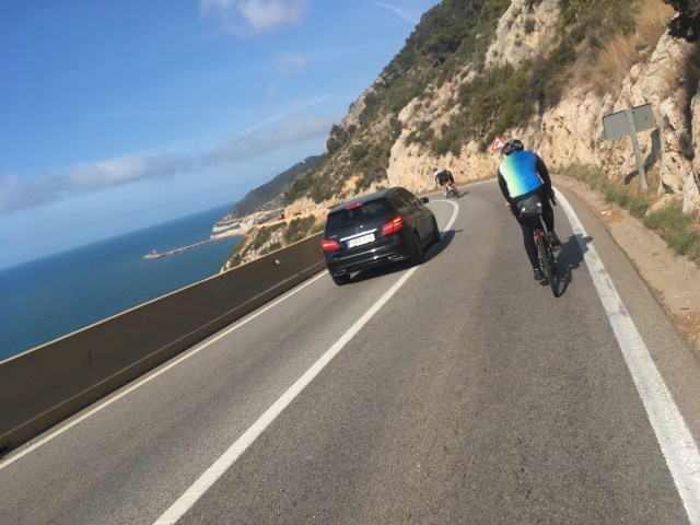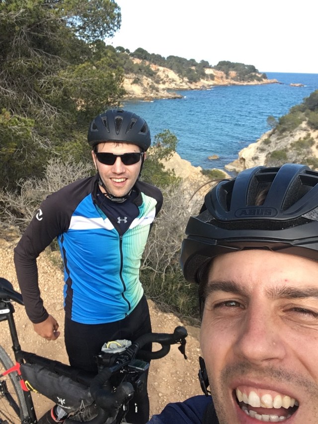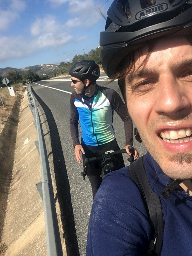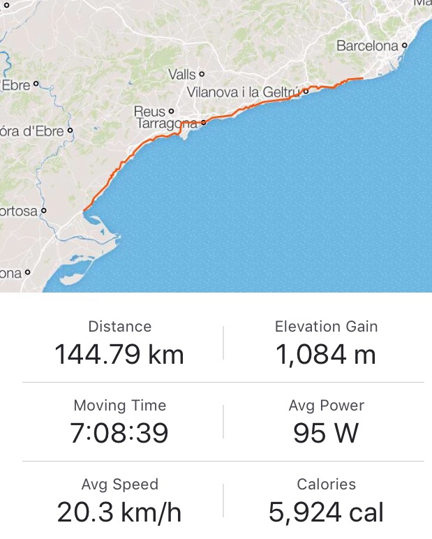 Am psychologisch wichtigen ersten Tag sind wir 145 kilometer gefahren. Davon circa 145 km mit Gegenwind. Wind, Pensionisten oder kleine Kinder die die Spur nicht halten – irgendwas ist uns ständig entgegengekommen. Es ist zwar Spanien bzw Barcelona aber durch den Wind wars eher Donauinsel-in-die-falsche-Richtung Feeling und tendentiell kühl. Das ist dann auch der Grund warum ich mich so gut eingeschmiert habe (not). Es is eh jedes Jahr das gleiche Theater aber so scharfe tan lines hab’ ich noch nie gehabt.