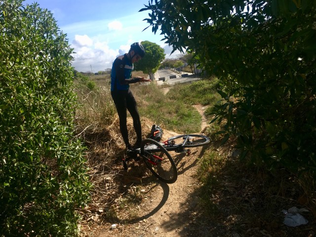 Danch waren dann noch einige “Routen” die maximal als Trampelpfade für spanische Katzis durchgehen. Aber wir sind gut vorbereitet, haben insgesamt vier Ersatzschläusche mit und ich kann meinen Vorderreifen sechs mal kleben bis endgültig game over ist. Hat auch gut funktioniert bis zu einer Route kurz vor Ende. Begonnen hat’s mit einem Tunnel unter der Autobahn durch den uns das Navi geschickt hat. Ich hab’ ja eigentlich nicht so schnell Angst vor irgendwas weil mir wahrscheinlich der Realitätssinn für viele Dinge fehlt oder ich finde, dass nur wenige Sachen im Leben wirklich wichtig sind. Aber in einen komplett stockfinsteren Tunnel im Nirgendwo, ohne dass man Licht am anderen Ende sieht, (alleine) reinspazieren macht mir Erwachsenenangst. Dafür habe ich zu viele Horrorfilmtrailer gesehen. Nicht mein Genre.