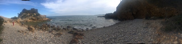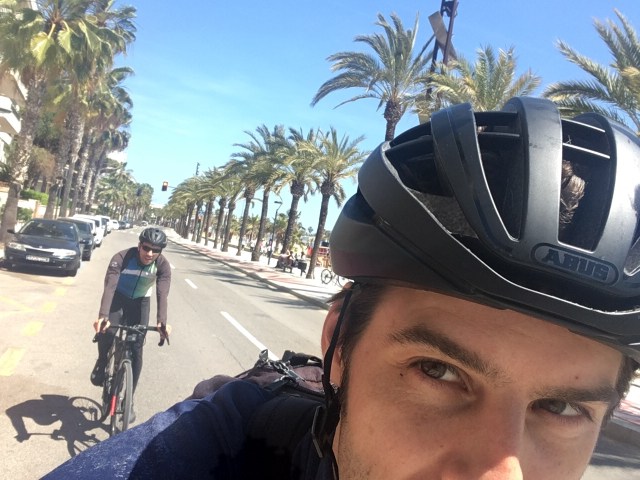 Unser nervöses Treiben hat irgendein Spanier chillend beobachtet. Der muss sich gedacht haben wir sind komplett deppat wie wir da mit unseren Rennrädern in den Grobschotterstrand reinstümpern!