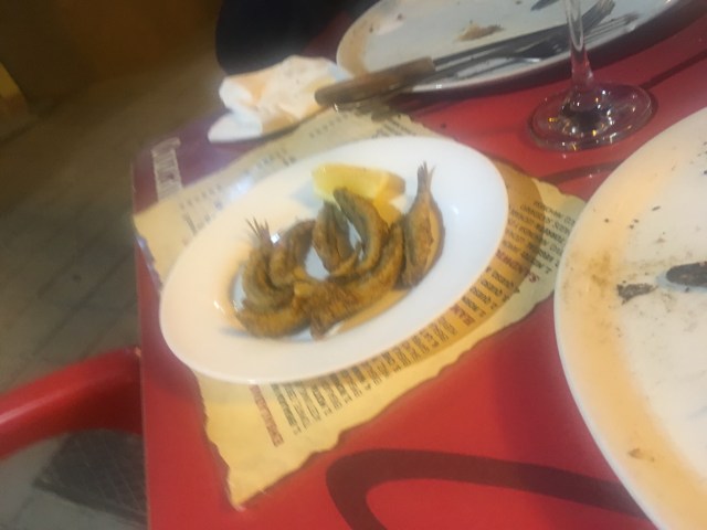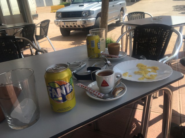 Puente de Génave besteht aus einer Brücke und drei Häusern, eines davon ist eine Pizzeria. Wir kommen um 20:30 Uhr in das konplett leere Lokal, die Kellnerin putzt gerade die Tische. Ungefragt bekommen wir eine Portion patatas bravas serviert. In unserem Leichtsinn und komplett ausgehungert bestellen wir noch eine Portion patatas, einen “Chef” Salat der alles hat was am Boden wächst plus Thunfisch, Garnelen und Lachs, und als Hauptspeise zwei Pizzen. Nach den patatas kämpfen wir gegen den Salat der sich als doch ziemlich üppig entpuppt. Noch bevor wir den Salat finishen stellt uns die Kellnerin ungefragt eine Portion Gulasch hin! Was sind denn das bitte für massive Grüße aus der Küche?! Um 21:30 Uhr füllt sich das Lokal langsam und wir bekommen unsere Pizzen serviert. An meiner Pizza Margharita scheitere ich fast. Wir sind dann irgendwann mit dem Essen fertig, glauben wir, und die Kellnerin stellt uns einen Teller mit Anchovies hin! Aus Höflichkeit esse ich eines, der Thomas bringt auch nicht mehr runter. Ein paar Minuten später kommt ein Kellner mit zwei Kebabs auf uns zu, vor Schrecken bin ich fast vom Sessel gefallen. Das hat dann zum Glück wer anderer essen müssen.