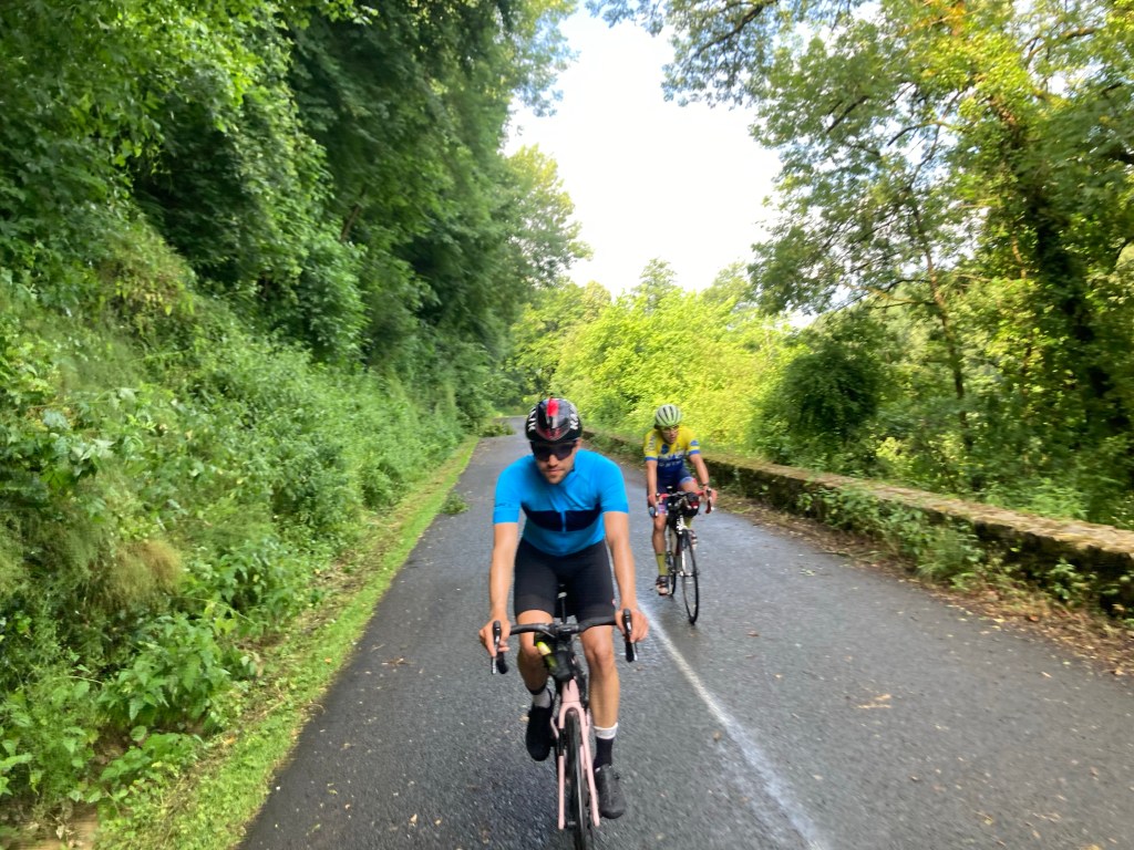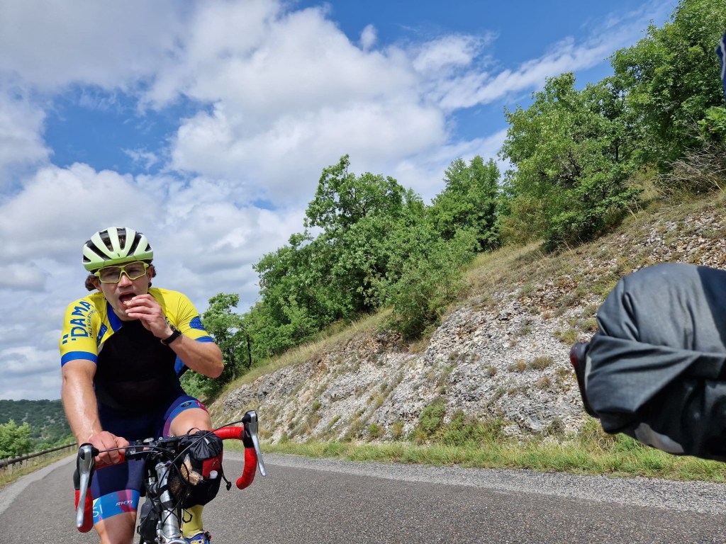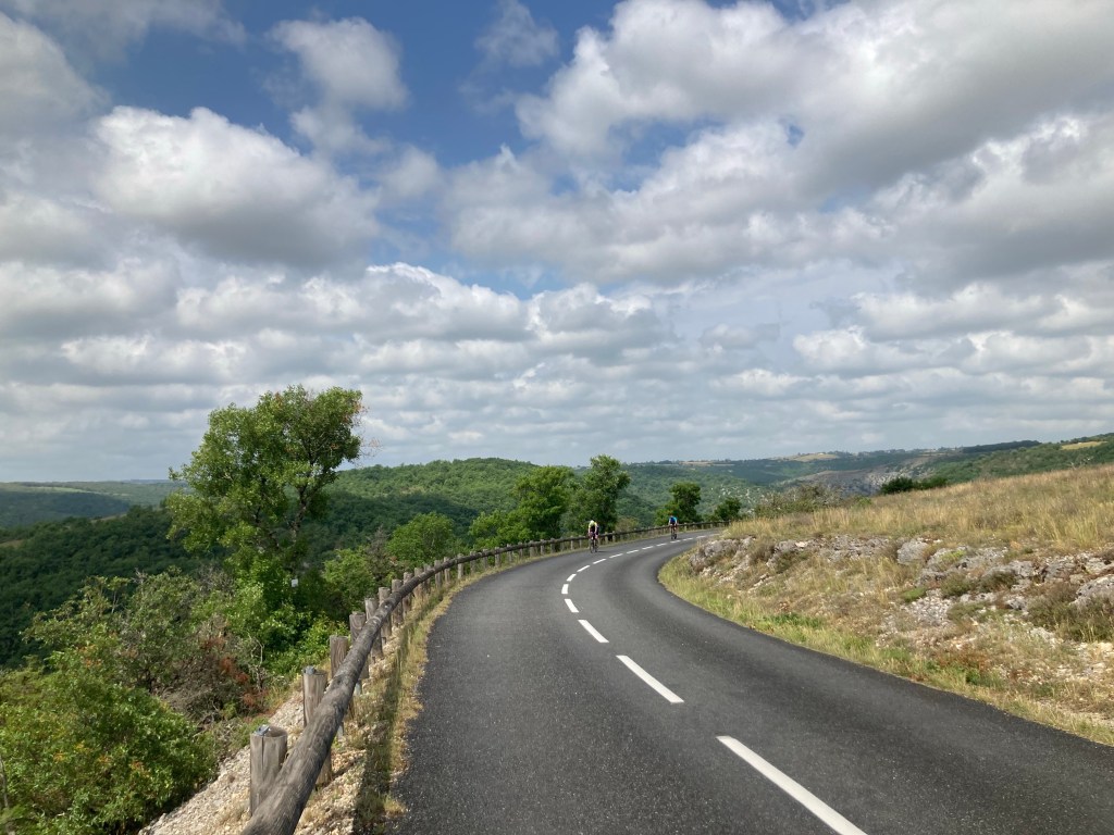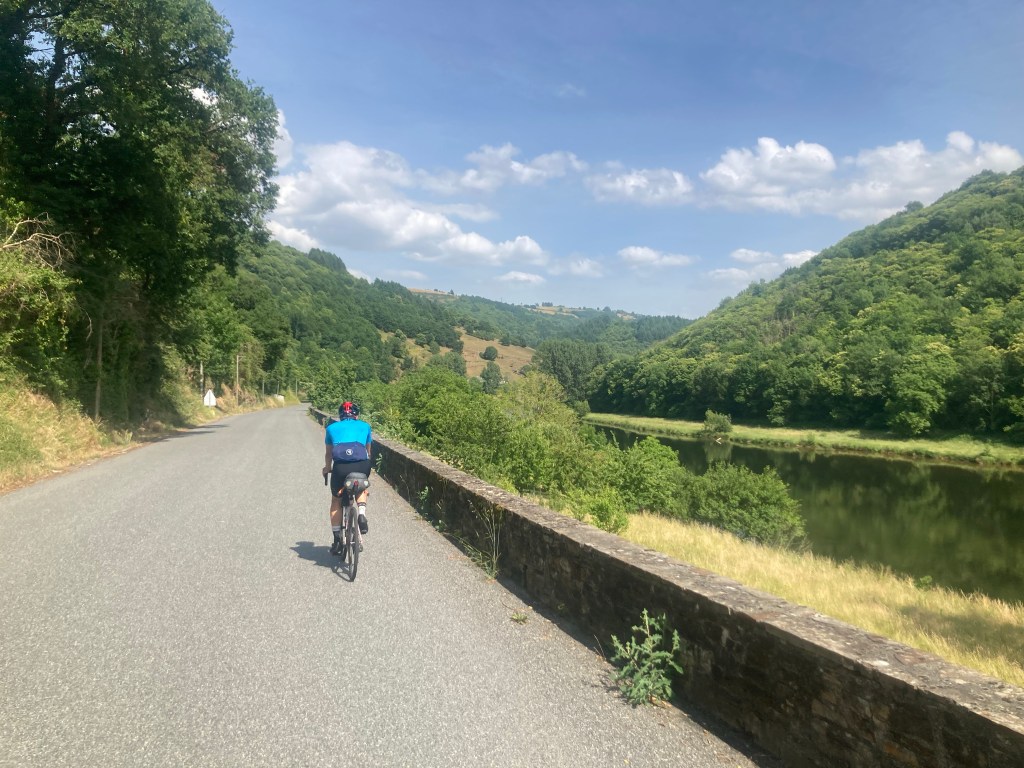 Wie auf den Fotos gibt’s hier wirklich wenig, sogut wie keine Menschen auf der Strecke, null Autos. Nach 40km derartigem Nichts kommen wir zu einer kleinen Stadt an der Leute auf Luftmatratzen im Wasser treiben und es laut Reggae Musik spielt. Hier übernachten wir im Hotel Les 2 Vallees, das Lot Tal trifft hier mit irgendeinem anderen Tal zusammen. Wo der Lärm herkommt haben wir nicht mehr herausgefunden, es läuft jetzt Menü 1: Zimmer mit Fahrradgewand dekorieren, duschen, essen, schlafen.