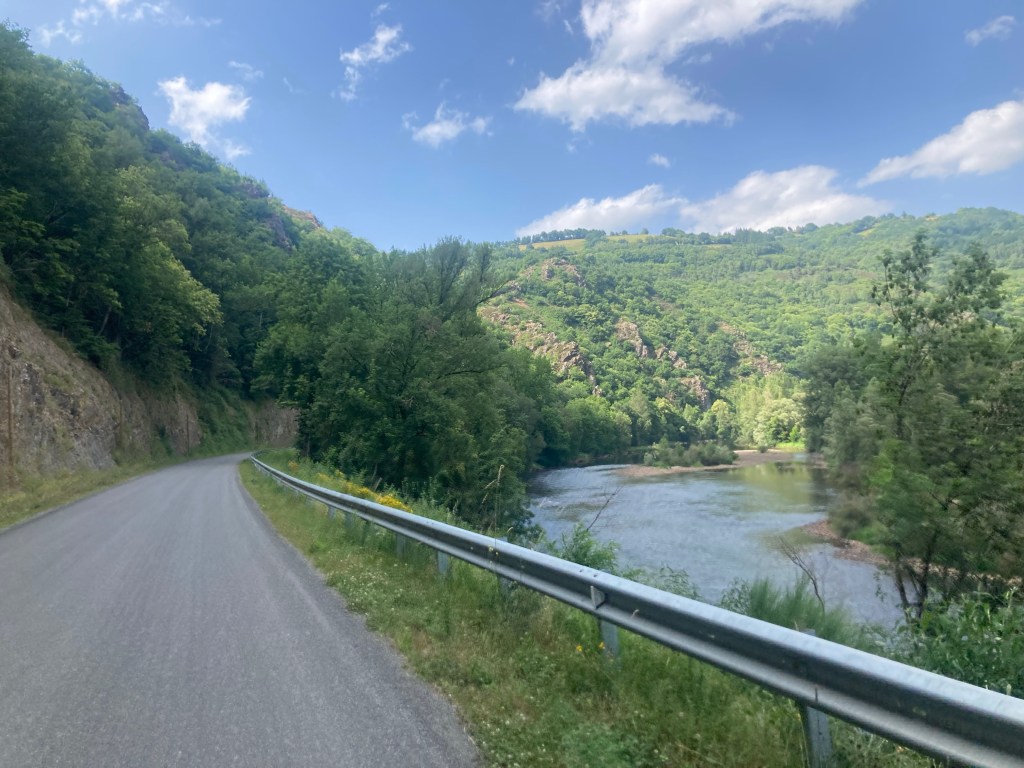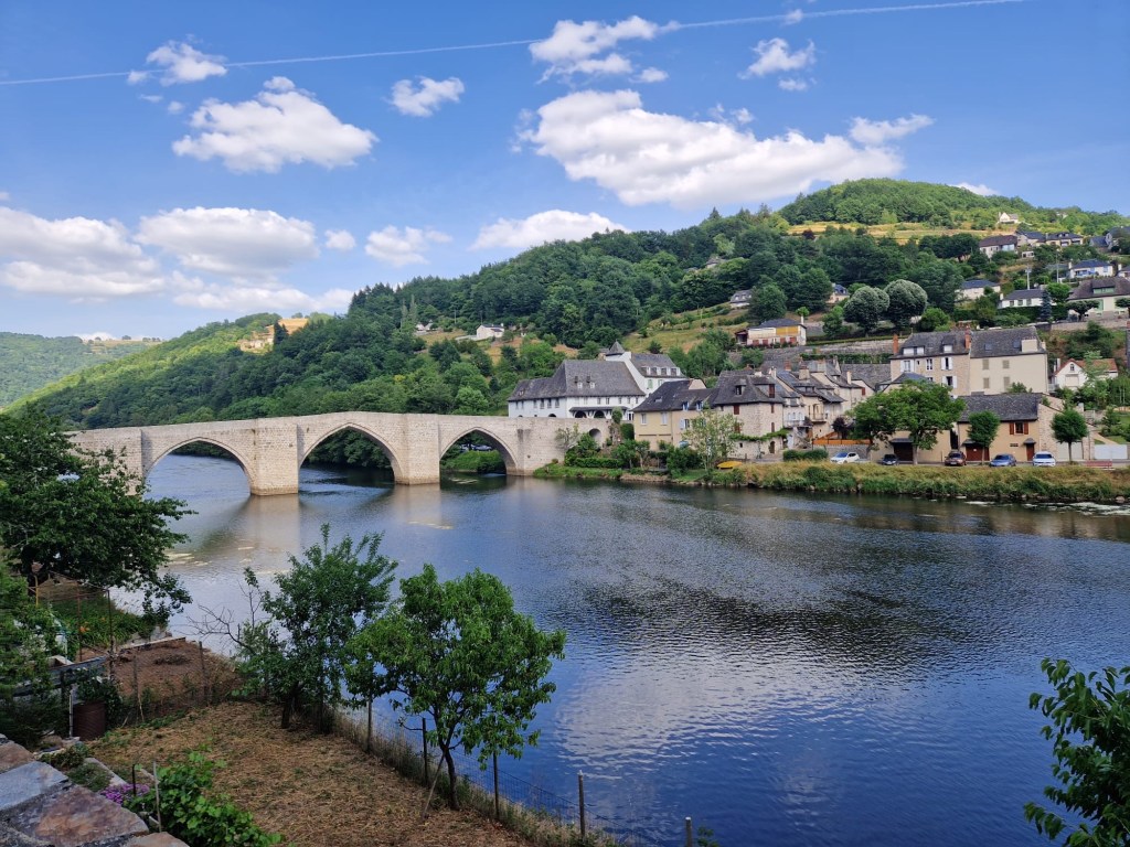 Nach zig Kilometern auf einem Plateau in dieser Killerhitze sind wir in Figeac wieder in die Ebene abgefahren und dem Fluss Lot entlang.