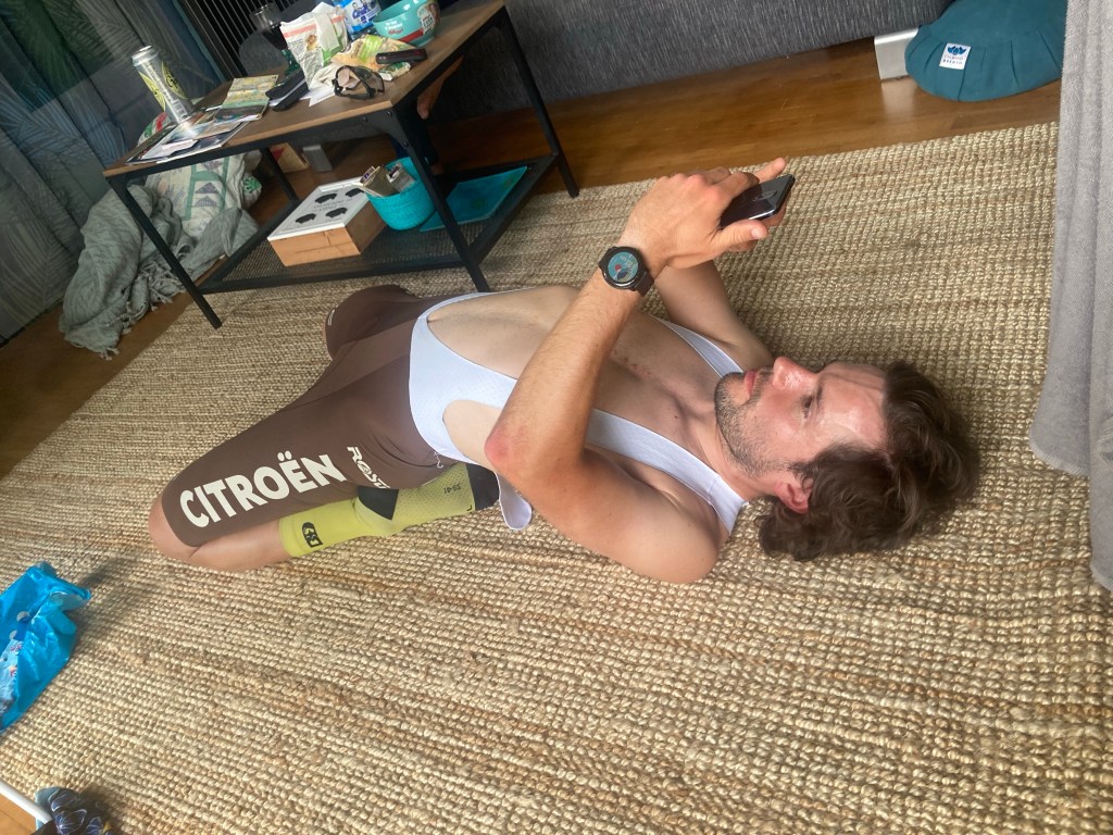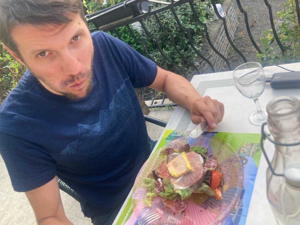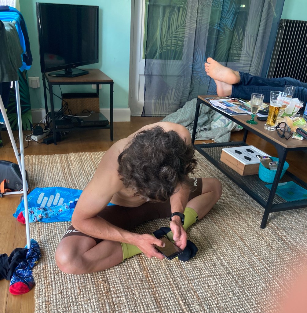 Der Ruhetag war herrlich, ewig schlafen, echtes Essen, auf einem echten Stuhl sitzen. Der Clemens kann keine Ruhe geben und ist nach 5 Stunden von einer 40km Runde zurückgekommen während der Rest sich mit circa 10 Runden Aperitif aufgewärmt hat. Die Flasche Champagner gleich nach dem Sport hat ihn noch sehr zum Dehnen motiviert, direkt danach haben dann seine Verwandten über Telefon dafür bezahlt und er selbst am nächsten Tag beim Fahrrad fahren.